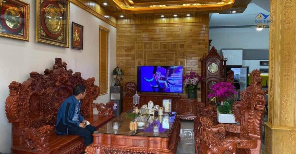 Phần nội thất biệt thự được bố trí hợp lý, các không gian, công năng từng phòng đều được chú trọng mang lại sự thoải mái và tiện dụng nhất cho mọi thành viên. Bước vào cửa chính đầu tiên chính là khu vực phòng khách, vì gia chủ rất thích nội thất gỗ sang trọng, có thể khẳng định được địa vị của bản thân, nên ngoài bàn ghế sử dụng là đồ gỗ, thì cột nhà, trần và một phần tường nhà cũng được ốp giả gỗ, kết hợp cùng hệ thống đèn chùm, đèn led mang lại một không gian sang trọng nhưng không kém phần ấm cúng.