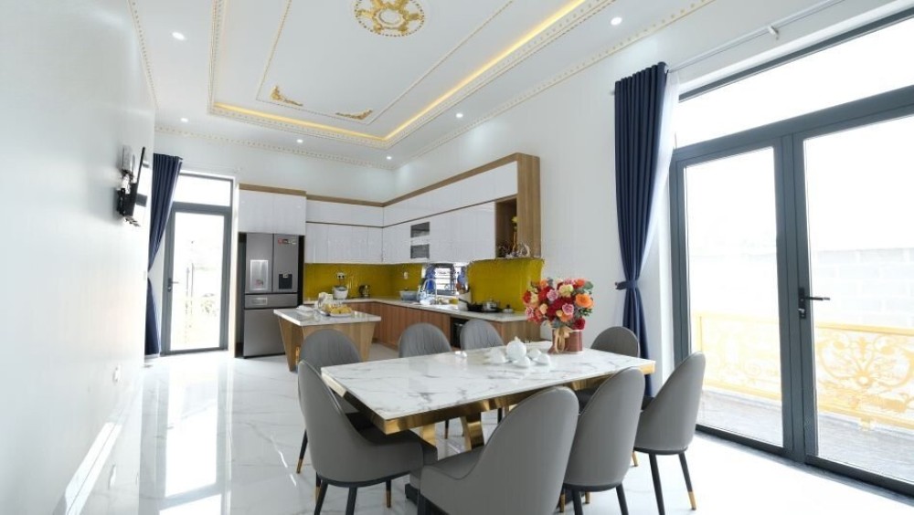 Phòng ăn và bếp liên thông với phòng khách tạo nên một không gian mở, thuận tiện di chuyển và gắn kết các thành viên.