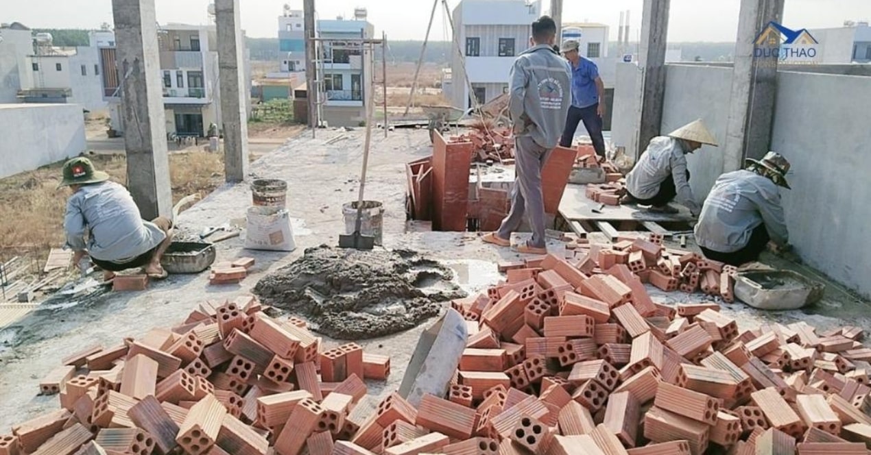 - Tiếp theo, công tác xây dựng khung nhà, bao gồm xây tường, cột, dầm và sàn nhà.