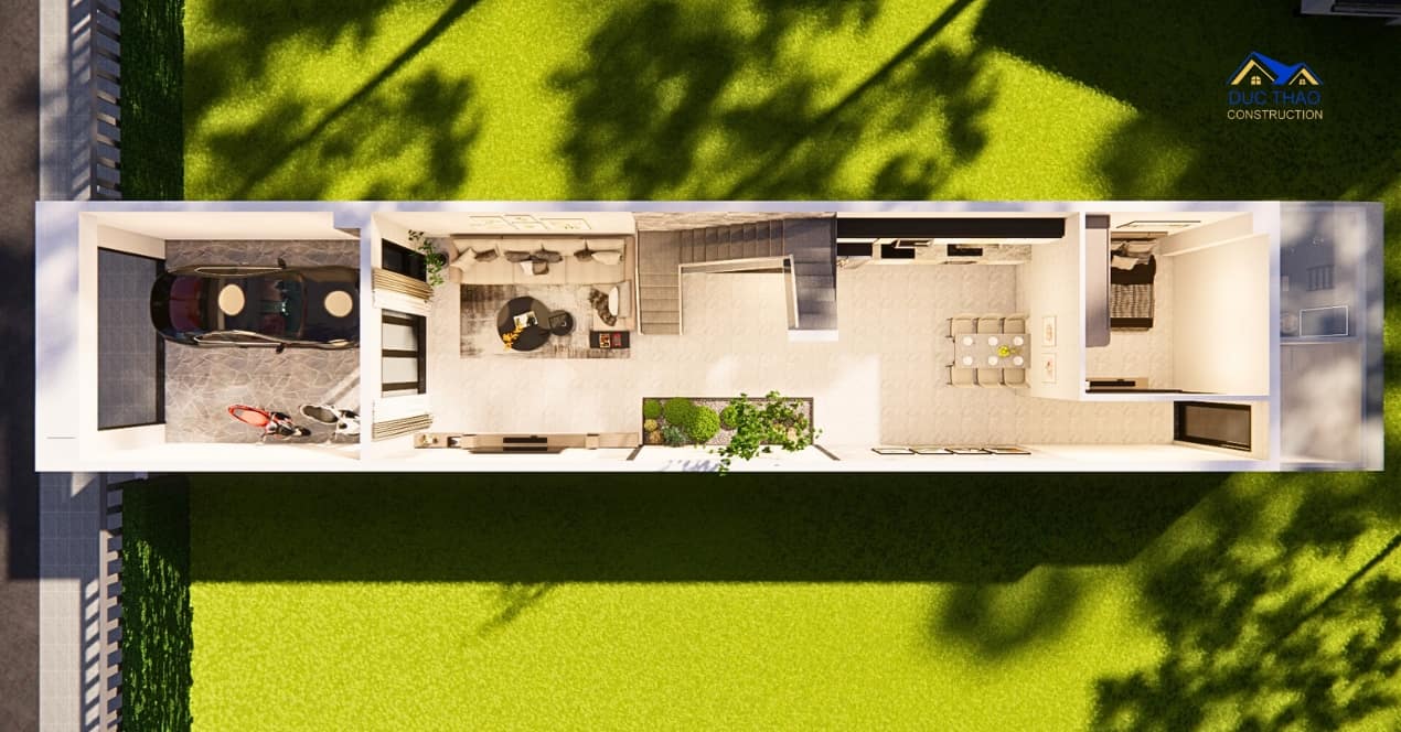 Sân vườn và phòng khách ngoài trời: Nhà phố 5x20 hiện đại này cũng có một không gian sân vườn và phòng khách ngoài trời, nơi bạn có thể thư giãn và tận hưởng không gian ngoài trời. Sân vườn có thể được trang trí bằng cây xanh, cây cỏ và hoa tạo nên một không gian xanh mát và thư thái