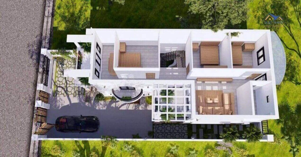 Do có góc chữ L nên biệt thự có 2 sảnh, chính và phụ, phòng khách ưu tiên đặt gần sảnh chính và bếp thì nằm gần sảnh phụ để không gian thông thoáng và nhiều ánh sáng hơn. Khu vực bếp và phòng khách sẽ được tách riêng biệt để không gây ảnh hưởng đến người sử dụng tại khu vực 2 phòng này. Các vùng còn lại được bố trí làm phòng ngủ và cầu thang lên tầng.