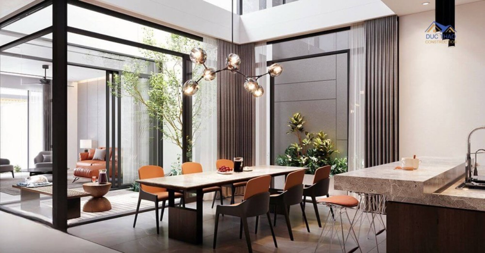 Nối giữa phòng khách và phòng bếp là một khoảng sân nhỏ thoáng mát, thông lên trên tạo thành một khoảng trong ngay trong nhà, mang đến không gian sống thông thoáng, có nhiều ánh sáng tự nhiên nhất, đây chính là giải pháp tuyệt vời để lấy sáng cho những căn biệt thự phố. Sử dụng cửa kính hoàn toàn để ngăn cách không gian nhưng lại không gây nên sự chia cắt, hạn chế khiến diện tích chật hẹp.