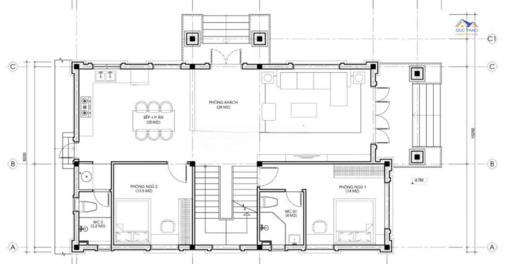 Quan sát mặt bằng tầng 1, bạn có thể thấy phòng khách của căn nhà được các kiến trúc sư của Đức Thảo thiết kế vô cùng rộng rãi với diện tích 28m2, sở hữu ô cửa sổ lớn và 2 lối đi ra phía bên ngoài, giúp tăng ánh sáng tự nhiên vào trong phòng và kết nối không gian bên trong với không gian bên ngoài. Phòng khách và phòng bếp được ngăn cách với nhau bởi vách lam. Thiết kế phòng bếp ấm áp có 1 cửa phụ đi ra sân sau tạo nên sự thuận tiện trong di chuyển cho các thành viên trong gia đình.