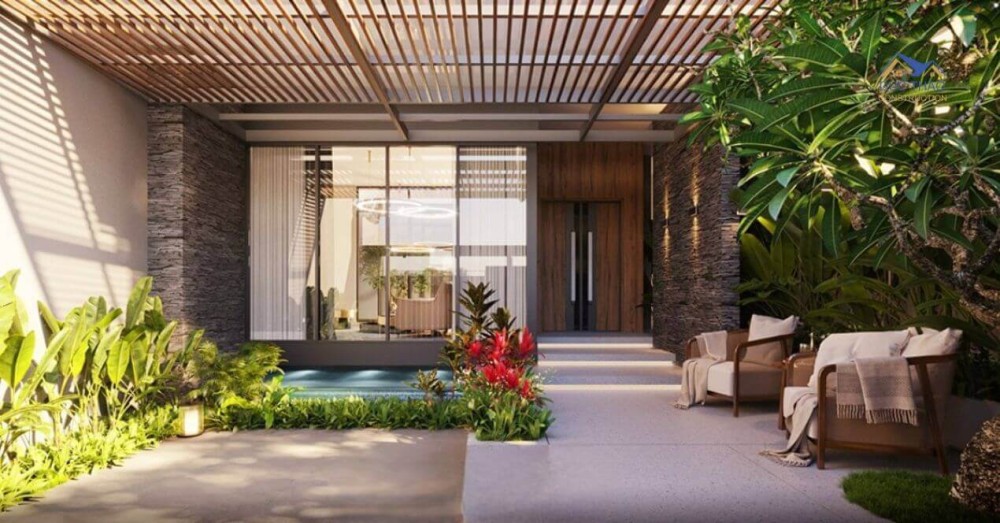 Sử dụng cửa kính trượt giúp kết nối không gian phòng và sân một cách liền mạch và thoáng mát hơn, hạn chế các điểm mù gây hẹp không gian. Khu vực phòng bếp chữ I và quầy bar dùng hệ thống tủ kệ bằng gỗ sang trọng, kết hợp với bàn ghế ăn bọc nệm xám hòa quyện với không gian thành một thể mang tính thẩm mỹ cao.