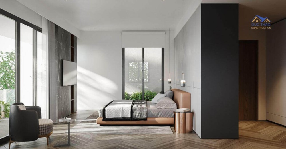 Nhất quán màu sắc các phòng trong nhà theo tông chính là xám và màu Cognac cho thấy sự liền mạch trong thiết kế mỗi phòng, thể hiện sự sang trọng hơn cho từng vùng. Phòng ngủ master được tích hợp cả bàn làm việc để tiện cho gia chủ sử dụng, kết hợp làm việc và nghỉ ngơi cùng một chỗ.