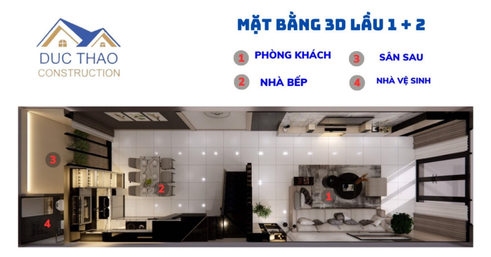 | Tầng 1 | Phòng khách + Phòng ănp + 1 Phòng ngủ + WC |