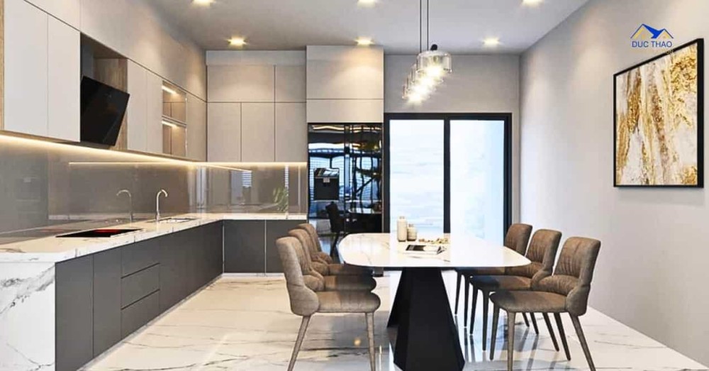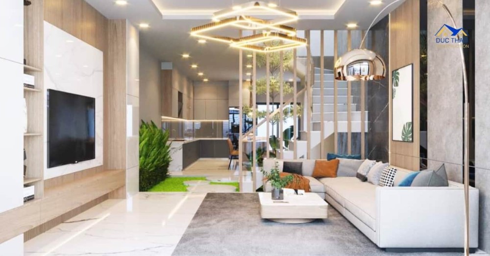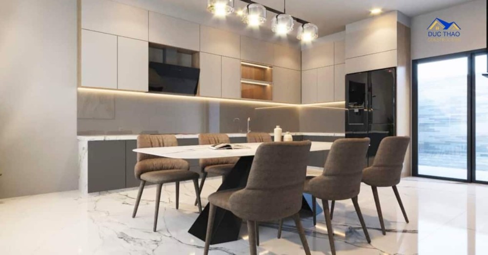 Tầng trệt của căn nhà là không gian chung, với phòng khách thoáng đãng và sang trọng. Sử dụng các tông màu nhạt nhằm tạo không gian mở, kết hợp cùng ánh sáng tự nhiên từ cửa sổ và cửa kính, nhà phố hiện đại thể hiện sự thoáng đãng và thông thoáng. Ngoài ra, không gian phòng bếp cũng được tối ưu hóa với thiết bị hiện đại và tiện nghi, tạo điều kiện thuận lợi cho người nội trợ.