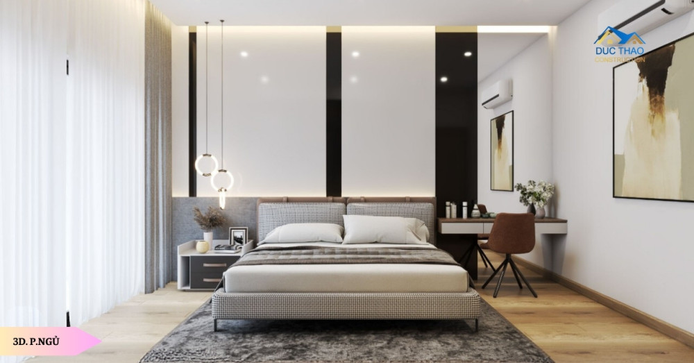 Thiết kế nội thất phòng khách và bếp hiện đại thường tập trung vào việc tối ưu hóa không gian và tạo ra môi trường sống thoải mái. Ánh sáng tự nhiên đóng vai trò quan trọng, với cửa sổ và kính lớn giúp kết nối không gian nội và ngoại thất, mang lại không khí tươi mới và thoáng đãng.Phòng Ngủ Sang Trọng: Trong phòng ngủ, sự thoải mái và sang trọng được đặt lên hàng đầu. Việc sử dụng đèn trang trí và ánh sáng nền mềm mại tạo nên không gian ấm cúng và thư giãn. Bố trí nội thất với các phụ kiện sang trọng, chất liệu cao cấp và màu sắc tinh tế làm tăng giá trị thẩm mỹ và thoải mái cho không gian riêng tư này. Phòng Tắm Hiện Đại: Phòng tắm hiện đại thường kết hợp giữa sự tiện nghi và thiết kế tinh tế. Sử dụng vật liệu cao cấp như kính, đá tự nhiên, và kim loại, kết hợp với đèn led tạo nên không gian sáng tạo và hiện đại. Các thiết bị vệ sinh thông minh và công nghệ tiên tiến giúp nâng cao trải nghiệm sử dụng và tạo điểm nhấn hiện đại cho phòng tắm.
