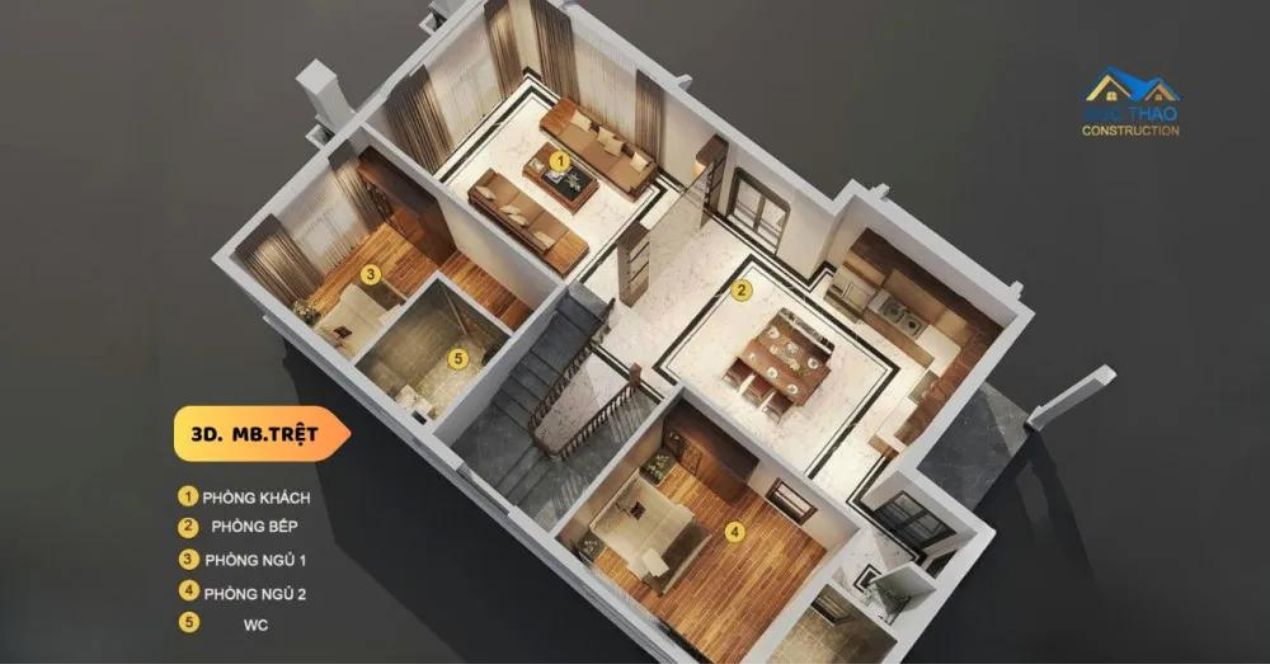 1.Tầng 1: Phòng khách: Là không gian đầu tiên khi bước vào biệt thự, phòng khách được đội ngũ thiết kế rộng rãi, thông thoáng và tràn ngập ánh sáng tự nhiên. Nội thất phòng khách sử dụng các chất liệu cao cấp, kết hợp giữa gỗ và đá, tạo nên một không gian tiếp khách sang trọng và ấm cúng.Phòng ăn và bếp: được thiết kế liền kề với phòng khách, tạo nên một không gian mở, thuận tiện cho việc sinh hoạt hàng ngày. Bếp ăn được trang bị các thiết bị hiện đại, đảm bảo tiện nghi và an toàn cho việc nấu nướng.Phòng ăn được bố trí gần cửa sổ lớn, cho phép ánh sáng tự nhiên tràn vào, tạo cảm giác thoải mái và dễ chịu.Phòng ngủ: Tầng 1 có một phòng ngủ, được thiết kế tiện nghi và thoải mái, phù hợp cho người lớn tuổi hoặc khách ở lại qua đêm. Phòng ngủ này đi kèm với một phòng vệ sinh riêng biệt, đảm bảo sự riêng tư và tiện lợi.