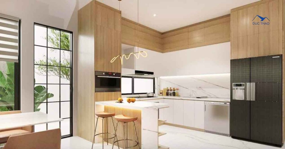 Bếp được thiết kế thông minh với các thiết bị hiện đại và không gian lưu trữ tiện lợi. Sự tối ưu hóa không gian và phong cách thiết kế tinh tế tạo ra một môi trường lý tưởng để nấu nướng và tận hưởng bữa ăn gia đình.