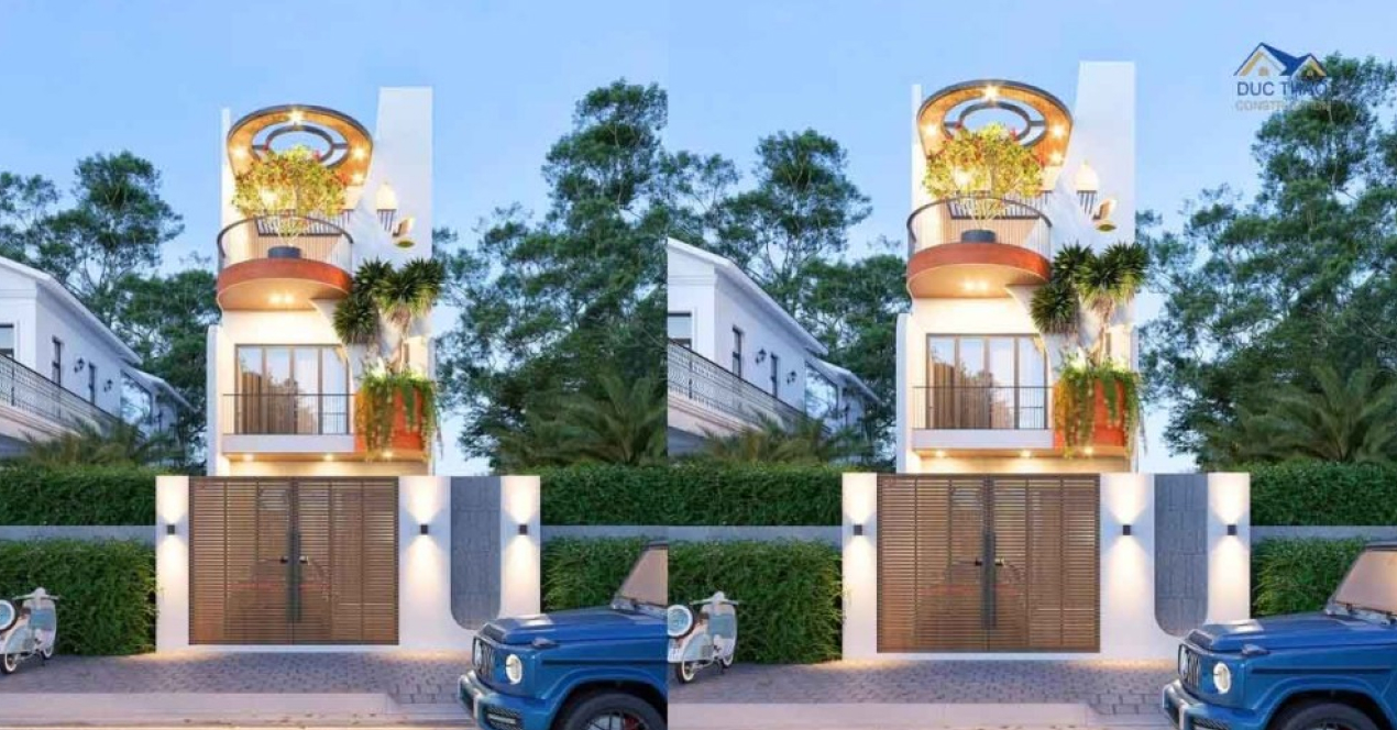 Mẫu thiết kế này chính là sự kết hợp hoàn hảo giữa vẻ đẹp sang trọng và tính tiện nghi. Với không gian hiên nhà, ban công và sân thượng được bố trí hợp lý, không gian sống được tối ưu hóa để đáp ứng mọi nhu cầu của gia đình. Những ô cửa sổ hình bán nguyệt trồng cây xanh và màu sơn trắng xen lẫn lát gỗ màu sáng càng tôn lên nét mềm mại của ngôi nhà. Chi tiết về mẫu thiết kế 3D căn nhà xem tại đây.