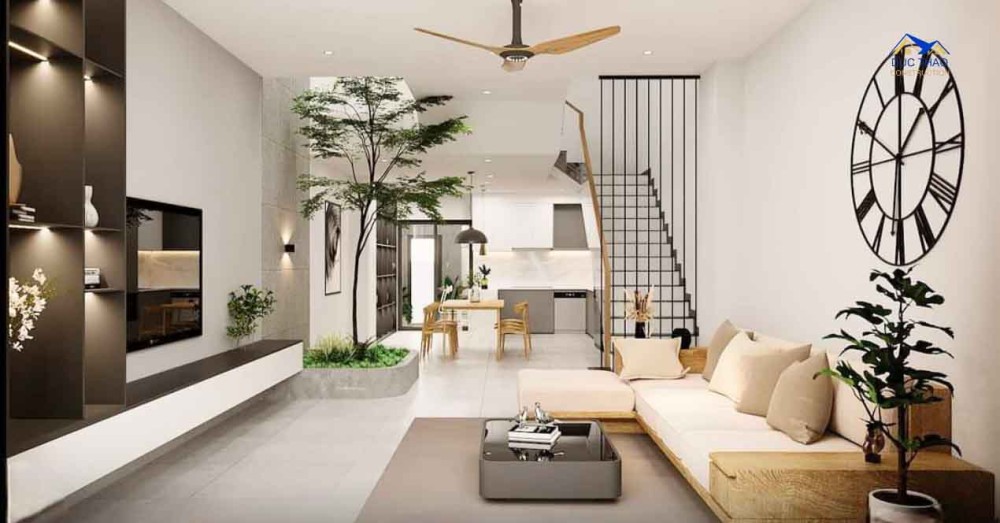 Tầng trệt là nơi để mang lại không gian sống thoải mái và dễ dàng liên kết với môi trường xung quanh. Phòng khách rộng rãi và sang trọng là nơi hoàn hảo để tiếp đón khách và thư giãn sau một ngày mệt mỏi. Nhờ các cửa sổ to lớn, ánh sáng tự nhiên tràn ngập không gian và mang lại cảm giác trong lành cho gia đình bạn.