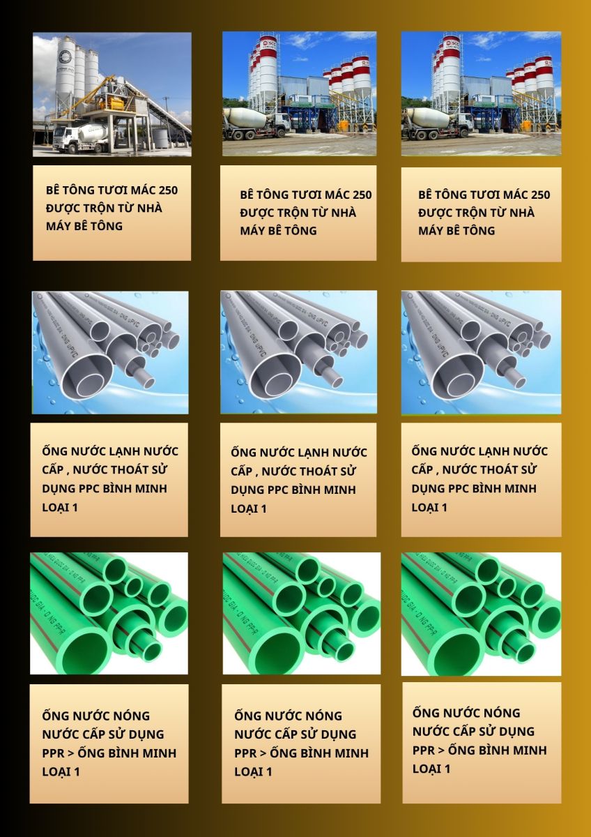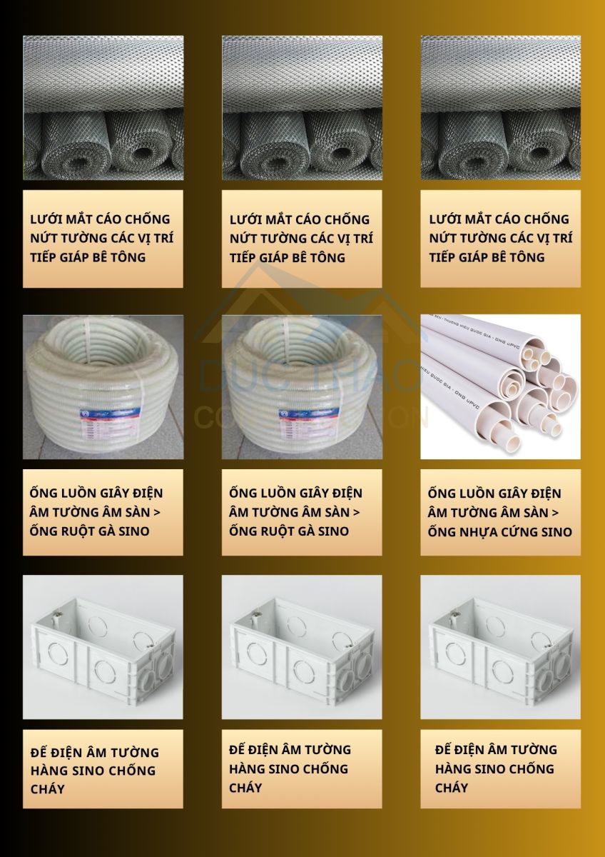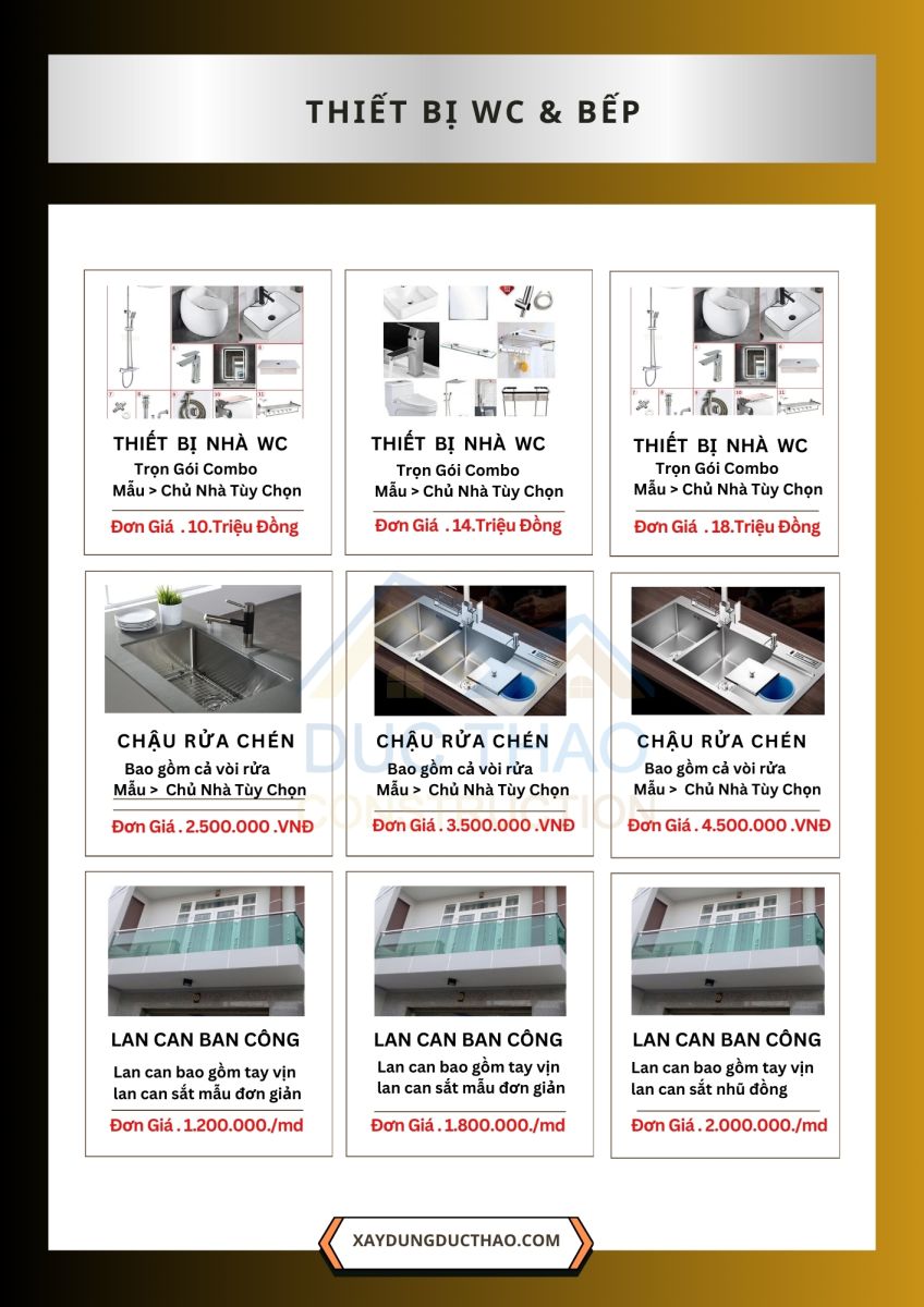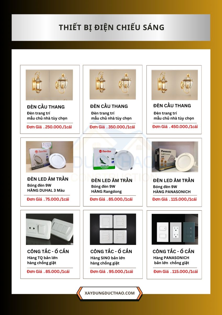 Tất cả vật liệu đều được cung ứng từ các nhà phân phối lớn, có thương hiệu rõ ràng và đạt chuẩn kỹ thuật. Khách hàng có thể lựa chọn gói vật tư phù hợp với ngân sách của mình, đồng thời được minh bạch bảng kê từng hạng mục.