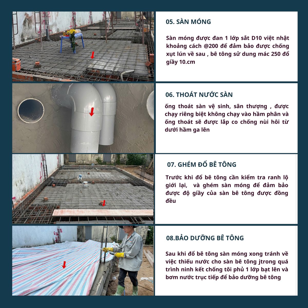 5. Thi công từng giai đoạn: Triển khai thi công từ phần móng, khung nhà đến hoàn thiện nội – ngoại thất.
