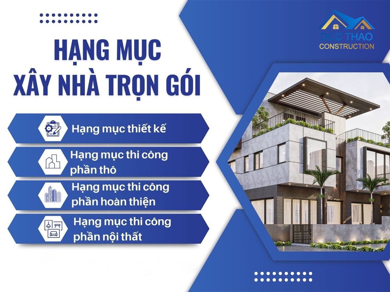 Xây dựng Đức Thảo là một trong những đơn vị uy tín lâu năm trong lĩnh vực thiết kế và thi công nhà trọn gói tại Long An với hơn 15 năm kinh nghiệm. Mỗi công trình tại Đức Thảo xây dựng sẽ đều được thiết kế cá nhân hóa theo yêu cầu của gia chủ. Đảm bảo không gian sống đáp ứng đúng nhu cầu và sở thích của gia chủ. Bên cạnh đó Đức Thảo luôn đảm bảo lợi ích cho khách hàng của mình. Những lý do khiến khách hàng luôn tin tưởng lựa chọn dịch vụ của chúng tôi:
