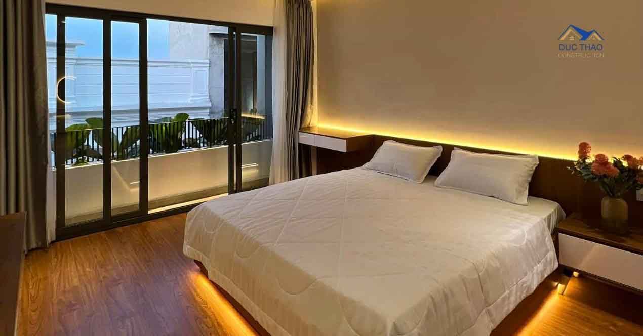 Điểm nhấn của ngôi nhà 5 tầng chính là sự phân chia không gian hợp lý tại các tầng trên. Mỗi tầng 2, 3 và 4 đều được bố trí 3 phòng ngủ riêng biệt, mỗi phòng đều có nhà vệ sinh (WC) khép kín, mang lại sự riêng tư và tiện lợi tối đa cho từng thành viên trong gia đình. Các phòng ngủ đều được thiết kế rộng rãi, thoáng đãng với hệ thống cửa sổ lớn và ban công riêng, giúp đón ánh sáng tự nhiên và gió trời, tạo cảm giác thư thái, dễ chịu. Từ việc lựa chọn màu sắc, vật liệu đến cách bố trí nội thất, mọi chi tiết đều được chăm chút tỉ mỉ, đảm bảo mỗi căn phòng là một không gian nghỉ ngơi lý tưởng, phản ánh cá tính của chủ nhân. Đây thực sự là những không gian an yên, nơi mọi người có thể tìm thấy sự riêng tư và thoải mái sau một ngày dài.