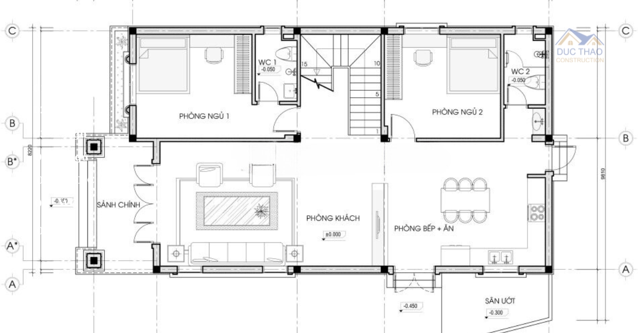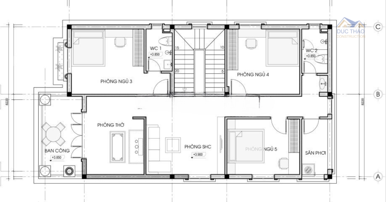 Di chuyển lên tầng 2, phòng sinh hoạt chung được bố trí diện tích vừa đủ. Diện tích còn lại là để đặt 4 phòng ngủ liền kề xung quanh ở tầng 2. Vị trí ở cuối nhà là đặt phòng giặt phơi và nhà vệ sinh chung của cả gia đình.