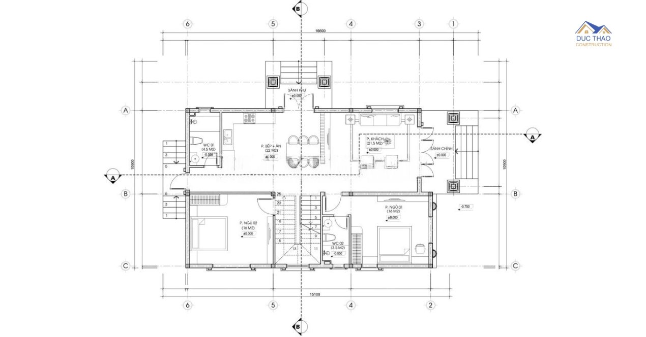 Phòng khách có diện tích 22,5m2, căn phòng này lấy ánh sáng nhờ vào 2 ô cửa sổ và hệ cửa chính. Phòng thờ có diện tích 10m2, phòng thờ không cần diện tích quá lớn nhưng cần phải đảm bảo được vị trí, hướng, không gian. Vách lam có tác dụng ngăn cách giữa phòng khách với phòng bếp ăn có diện tích 21m2, bếp ăn được đặt hệ tủ bếp hình chữ L, bố trí lối đi ra khu vực sảnh phụ, tiện cho việc đi lại thông thoáng hơn.