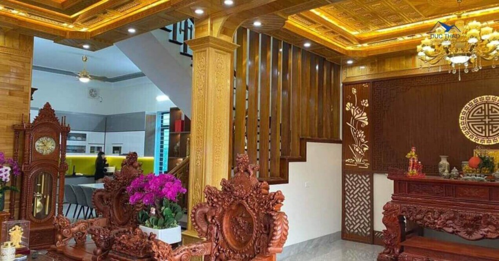 Phần nội thất biệt thự được bố trí hợp lý, các không gian, công năng từng phòng đều được chú trọng mang lại sự thoải mái và tiện dụng nhất cho mọi thành viên. Bước vào cửa chính đầu tiên chính là khu vực phòng khách, vì gia chủ rất thích nội thất gỗ sang trọng, có thể khẳng định được địa vị của bản thân, nên ngoài bàn ghế sử dụng là đồ gỗ, thì cột nhà, trần và một phần tường nhà cũng được ốp giả gỗ, kết hợp cùng hệ thống đèn chùm, đèn led mang lại một không gian sang trọng nhưng không kém phần ấm cúng.