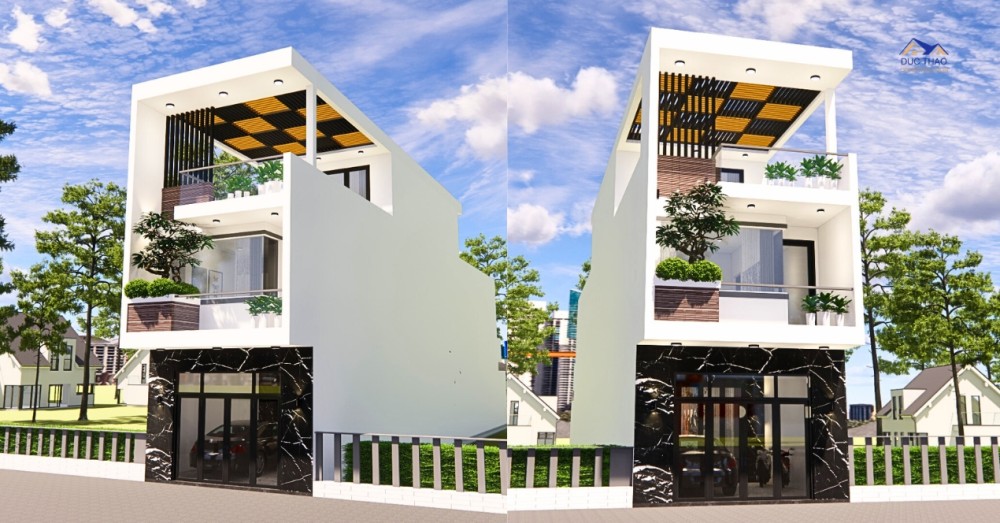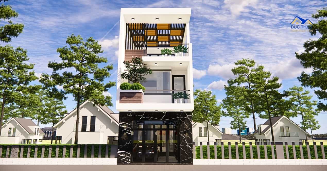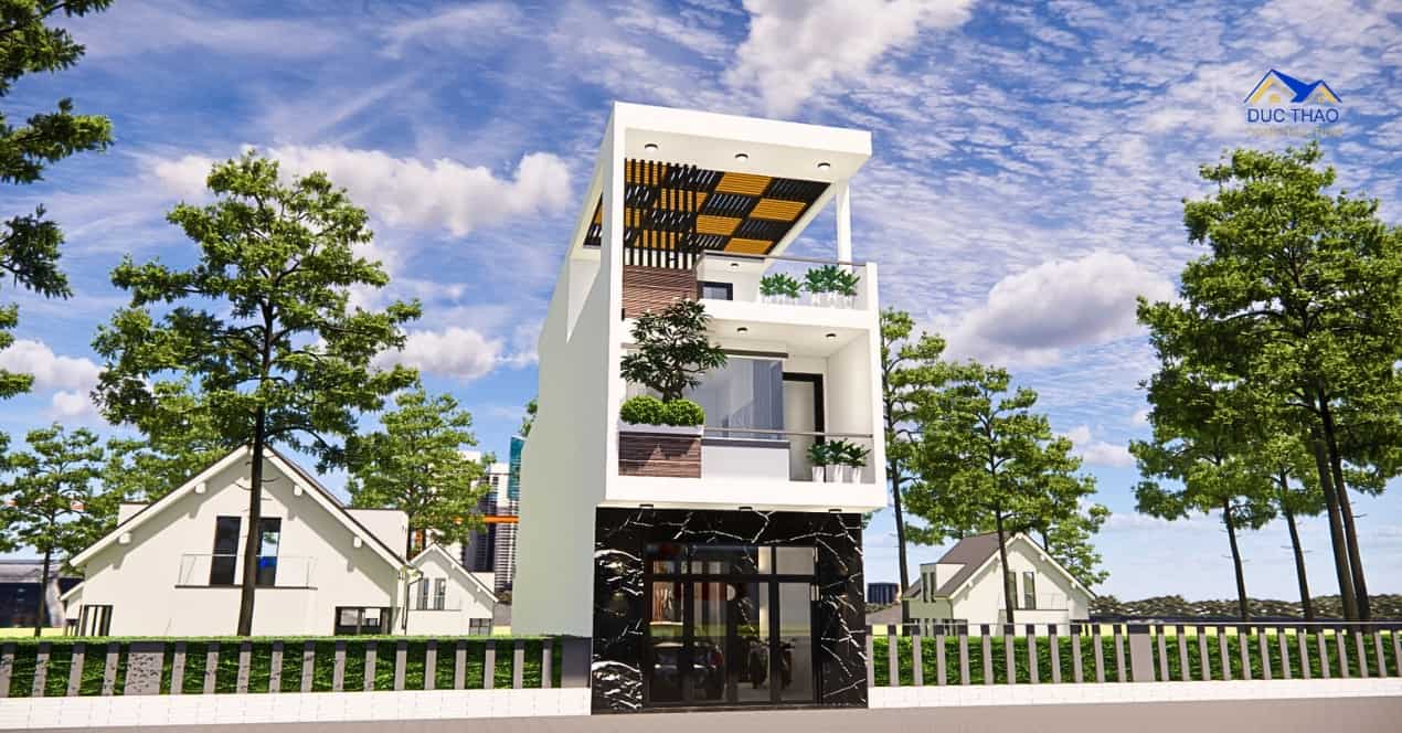 Thiết kế hiện đại: Nhà phố 5x20 tiêu chuẩn hiện đại với các đường nét tinh tế và phong cách đương đại. Các bức tường và cửa hàng sử dụng chất liệu bê tông, kính và kim loại, tạo nên một diện mạo thanh lịch và sang trọng.