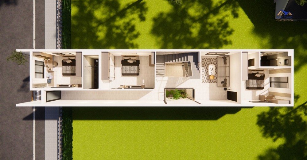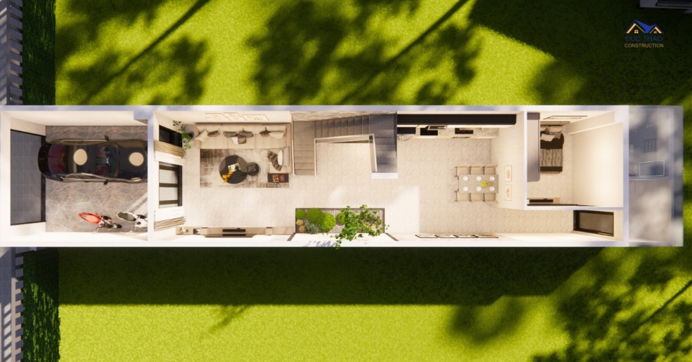 Sân vườn và phòng khách ngoài trời: Nhà phố 5x20 hiện đại này cũng có một không gian sân vườn và phòng khách ngoài trời, nơi bạn có thể thư giãn và tận hưởng không gian ngoài trời. Sân vườn có thể được trang trí bằng cây xanh, cây cỏ và hoa tạo nên một không gian xanh mát và thư thái