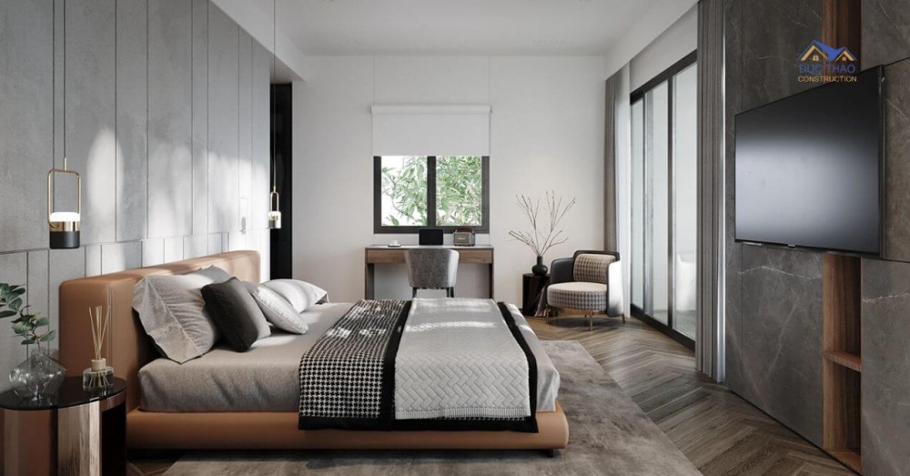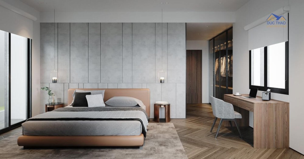 Không gian phòng bếp được bố trí khoa học, sử dụng tông màu gỗ kết hợp với màu xám trong nội thất để đồng nhất màu sắc trong bố cục mà vẫn giúp cho bếp ăn trở nên ấm áp cho gia đình khi sử dụng. Tiến vào phòng ngủ ở tầng 2, không có nhiều sự khác biệt về màu sắc so với phòng khách và phòng bếp. Vẫn sử dụng các tông màu chính là xám, be và gỗ làm chủ đạp, vừa làm sang trọng thiết kế vừa đảm bảo tạo cảm giác ấm cúng cho không gian phòng ngủ.