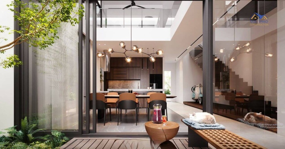 Nối giữa phòng khách và phòng bếp là một khoảng sân nhỏ thoáng mát, thông lên trên tạo thành một khoảng trong ngay trong nhà, mang đến không gian sống thông thoáng, có nhiều ánh sáng tự nhiên nhất, đây chính là giải pháp tuyệt vời để lấy sáng cho những căn biệt thự phố. Sử dụng cửa kính hoàn toàn để ngăn cách không gian nhưng lại không gây nên sự chia cắt, hạn chế khiến diện tích chật hẹp.