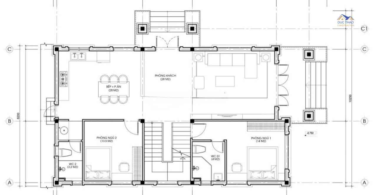 Quan sát mặt bằng tầng 1, bạn có thể thấy phòng khách của căn nhà được các kiến trúc sư của Đức Thảo thiết kế vô cùng rộng rãi với diện tích 28m2, sở hữu ô cửa sổ lớn và 2 lối đi ra phía bên ngoài, giúp tăng ánh sáng tự nhiên vào trong phòng và kết nối không gian bên trong với không gian bên ngoài. Phòng khách và phòng bếp được ngăn cách với nhau bởi vách lam. Thiết kế phòng bếp ấm áp có 1 cửa phụ đi ra sân sau tạo nên sự thuận tiện trong di chuyển cho các thành viên trong gia đình.