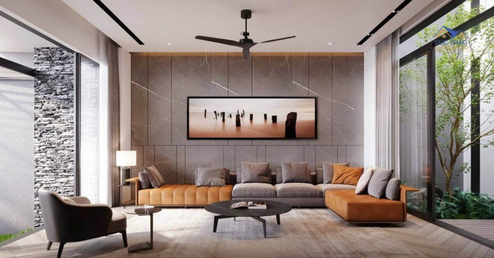 Bên trong nội thất được thiết kế hiện đại, với cách bố trí không gian cực kỳ độc đáo. Phòng khách sử dụng màu xám bê kết hợp cognac ấm áp cho sự đối lập tinh tế. Điểm đặc biệt trong kiến trúc nội thất của mẫu thiết kế này đó là khoảng sân trong, giữa phòng khách và phòng bếp có vai trò như một chiếc giếng trời tạo nên một vùng thoáng khí, vừa cấp sáng cho phòng khách lẫn phòng bếp.