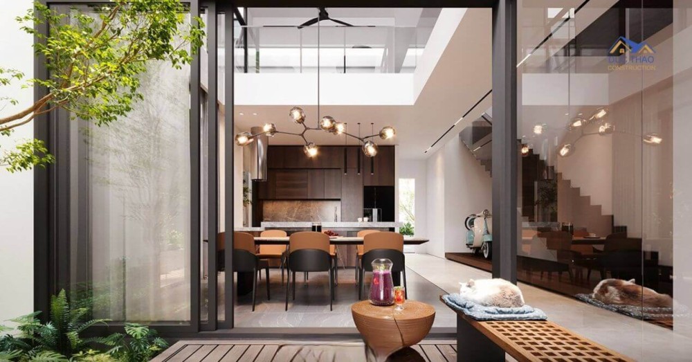 Sử dụng cửa kính trượt giúp kết nối không gian phòng và sân một cách liền mạch và thoáng mát hơn, hạn chế các điểm mù gây hẹp không gian. Khu vực phòng bếp chữ I và quầy bar dùng hệ thống tủ kệ bằng gỗ sang trọng, kết hợp với bàn ghế ăn bọc nệm xám hòa quyện với không gian thành một thể mang tính thẩm mỹ cao.