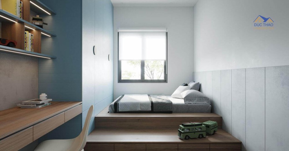 Phòng ngủ nhỏ dành cho trẻ được thiết kế nhiều màu sắc hơn để phù hợp với tính cách của trẻ. Khu vực giường ngủ được thiết kế thành bệ gỗ, vừa nâng cao giường lên khỏi mặt sàn, vừa tạo thêm không gian lưu trữ đồ ở dưới gầm. Tủ quần áo đặt phía cuối giường gắn liền vào là bàn học của bé, giúp tối ưu không gian và phát huy công năng từng phần trong phòng.