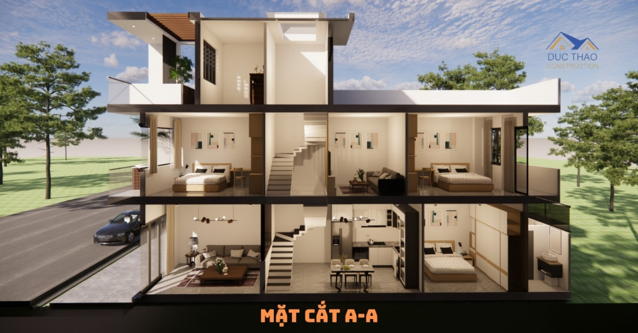 3D mặt cắt nhà phố 3 tầng