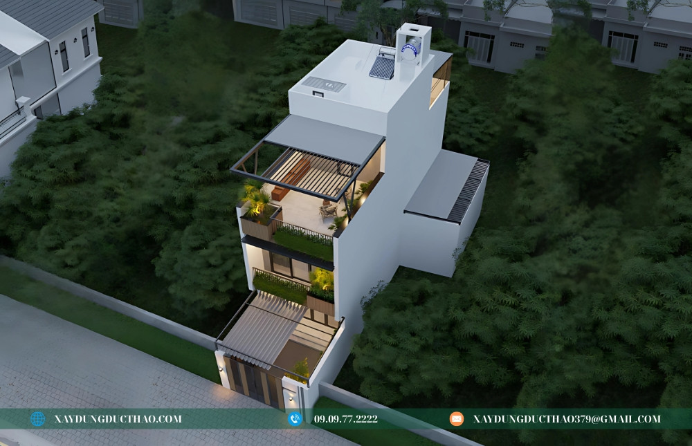 Cuối cùng là Tầng 3, không gian mang ý nghĩa tâm linh và tiện ích đa năng. Phòng thờ được bố trí ở vị trí trang nghiêm và yên tĩnh nhất, thể hiện sự tôn kính và gìn giữ nét đẹp văn hóa truyền thống của gia đình Việt. Phía trước là sân thượng rộng rãi, một không gian mở lý tưởng cho nhiều mục đích sử dụng: từ khu vực giặt phơi tiện lợi, đến nơi tập thể dục buổi sáng trong lành hay tổ chức những buổi tiệc BBQ ấm cúng cùng bạn bè và người thân. Tương tự như tầng 2, ban công tầng 3 tiếp tục mở ra một không gian thoáng đãng, giúp ngôi nhà luôn mát mẻ và đón gió, tạo sự lưu thông không khí tuyệt vời.