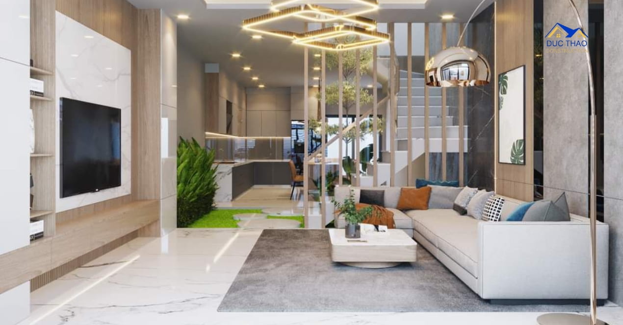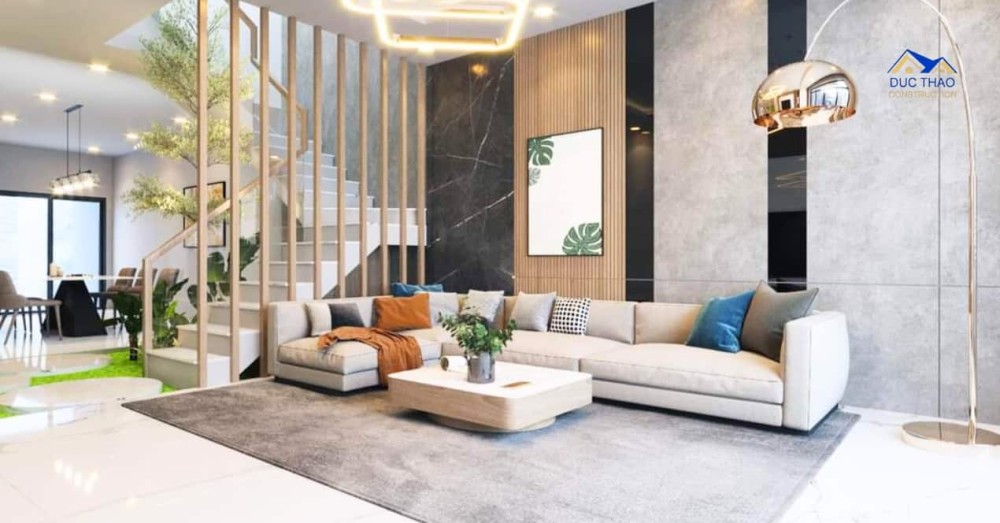 Tầng trệt của căn nhà là không gian chung, với phòng khách thoáng đãng và sang trọng. Sử dụng các tông màu nhạt nhằm tạo không gian mở, kết hợp cùng ánh sáng tự nhiên từ cửa sổ và cửa kính, nhà phố hiện đại thể hiện sự thoáng đãng và thông thoáng. Ngoài ra, không gian phòng bếp cũng được tối ưu hóa với thiết bị hiện đại và tiện nghi, tạo điều kiện thuận lợi cho người nội trợ.