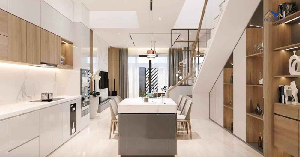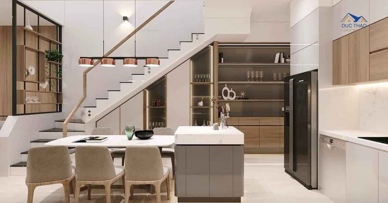 Tầng trệt thường được sử dụng làm không gian chung bao gồm phòng khách, phòng ăn và bếp. Thiết kế mở cho phép ánh sáng tự nhiên lọt vào căn nhà và tạo nên không gian thông thoáng. Đồng thời, kết cấu vòm của mặt tiền tạo nên một không gian vô cùng ấn tượng và nổi bật.