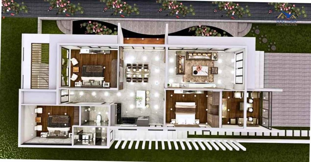 Ngôi nhà có kiến trúc hiện đại mang đến không gian sống thoải mái và tối ưu. Với diện tích xây dựng 80m2, ngôi nhà được thiết kế để sử dụng tối đa không gian mà vẫn đảm bảo tính riêng tư cho các thành viên trong gia đình.Khi bạn bước vào ngôi nhà, bạn sẽ bị cuốn hút bởi một không gian rộng lớn trong phòng khách, bếp và phòng ăn. Thiết kế thông minh giữa các phòng này tạo ra một không gian mở và thoáng đãng. Sàn nhà đươc lát gỗ tự nhiên, tạo nên cảm giác ấm cúng và sang trọng.