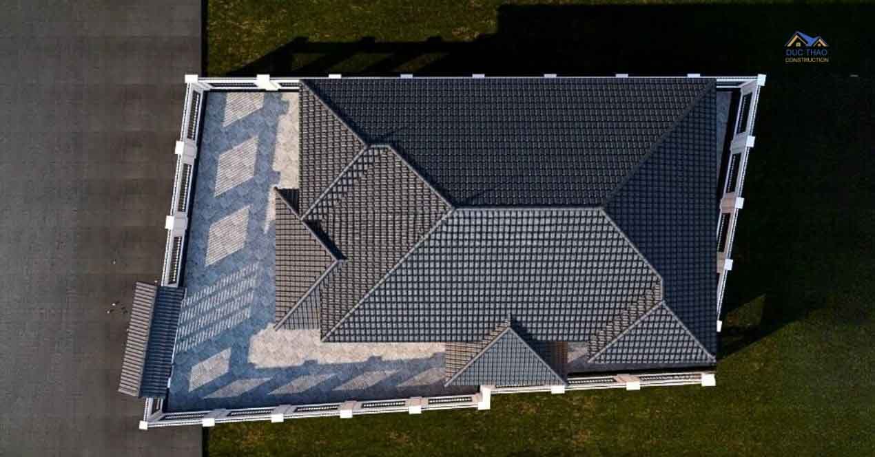 Phần mái được thiết kế theo kiểu mái Nhật màu xanh lịch lãm, trẻ trung và có độ dốc vừa phải, giúp thoát nước tốt. Phần mái phía trước đua rộng, tạo thành khoảng hiên lớn giúp che chắn cho phần sảnh chính bên dưới khỏi nắng, mưa.