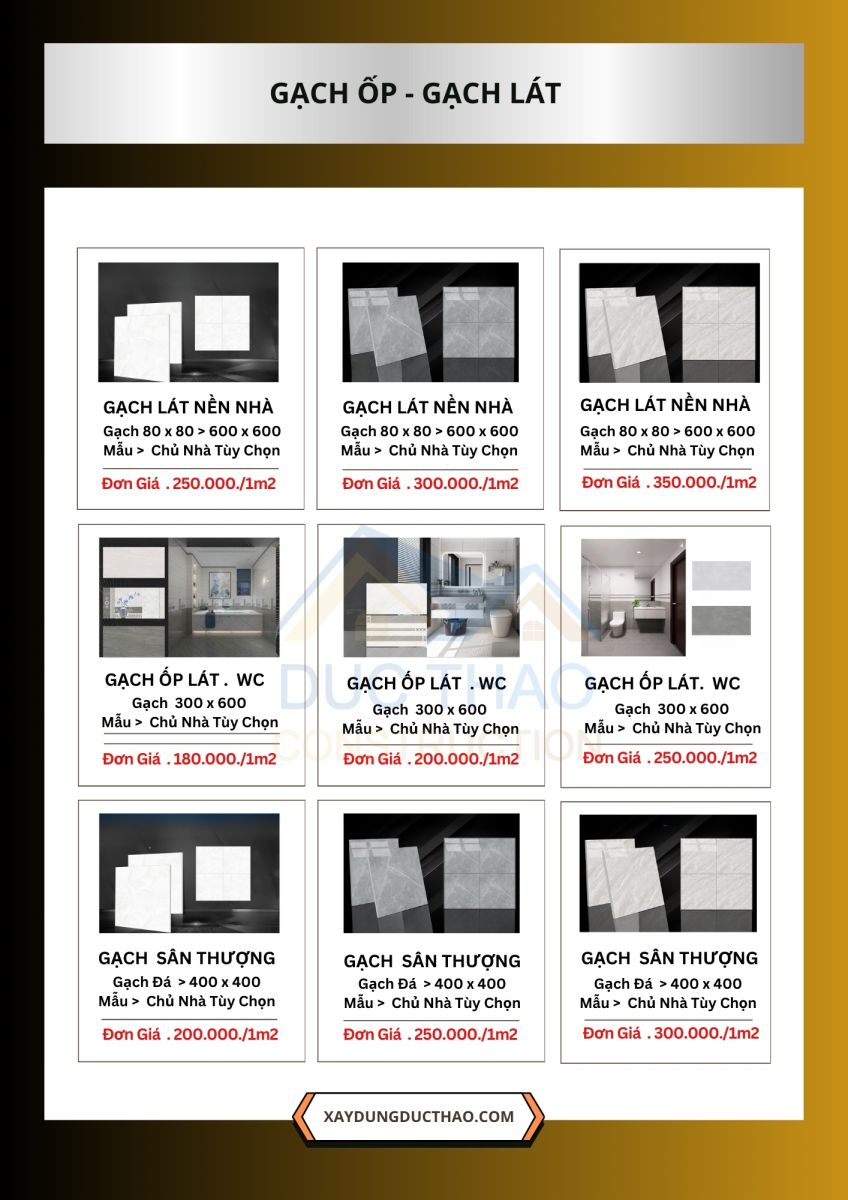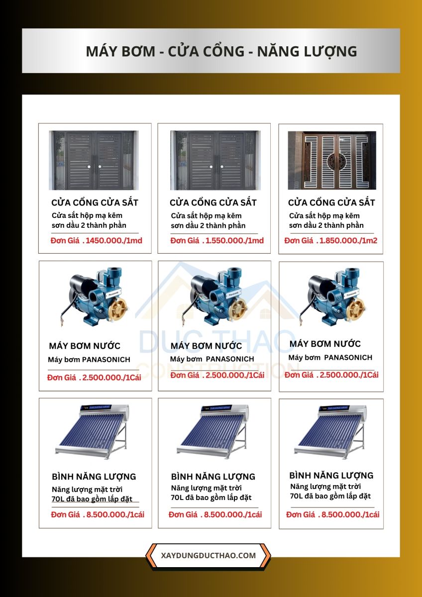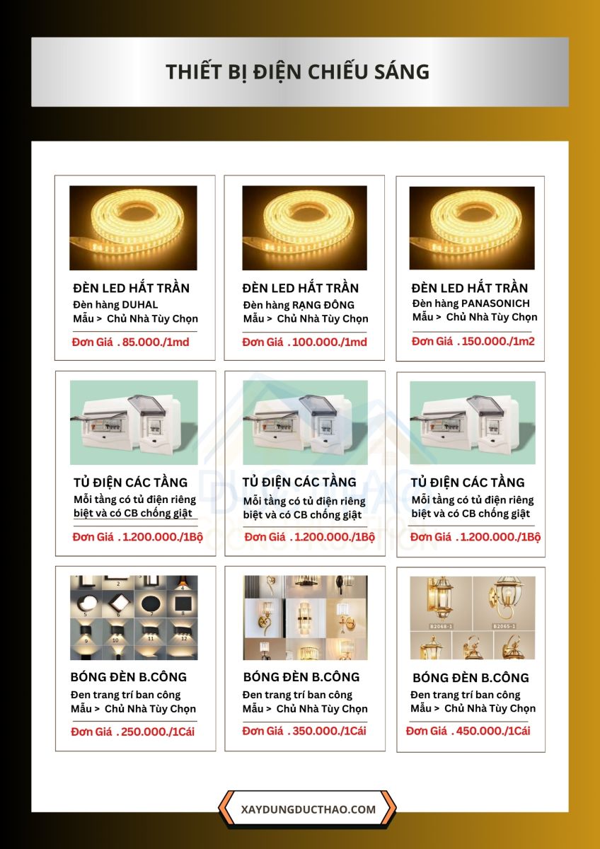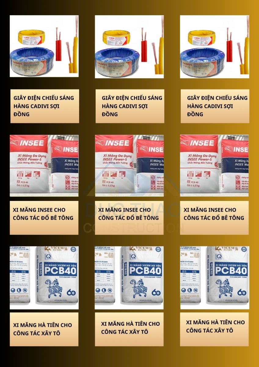 Tất cả vật liệu đều được cung ứng từ các nhà phân phối lớn, có thương hiệu rõ ràng và đạt chuẩn kỹ thuật. Khách hàng có thể lựa chọn gói vật tư phù hợp với ngân sách của mình, đồng thời được minh bạch bảng kê từng hạng mục.