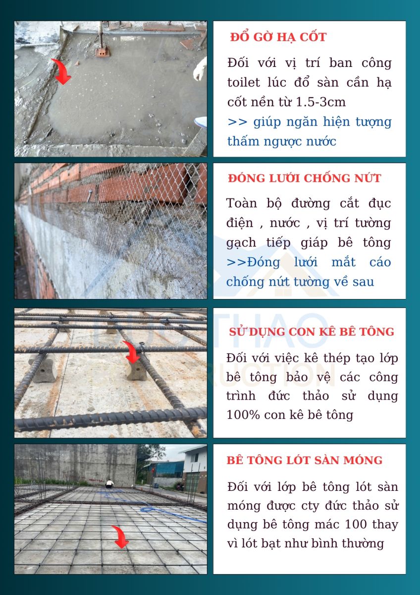 Trả lời: Do khí hậu nắng mưa thất thường tại Đồng Nai, việc bảo trì chống thấm, xử lý ẩm mốc là rất quan trọng. Đức Thảo cung cấp chính sách bảo hành lâu dài, đồng thời hướng dẫn khách hàng cách bảo trì định kỳ để đảm bảo công trình luôn bền đẹp và an toàn.